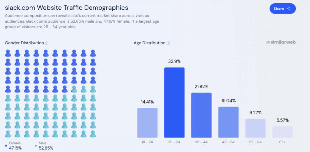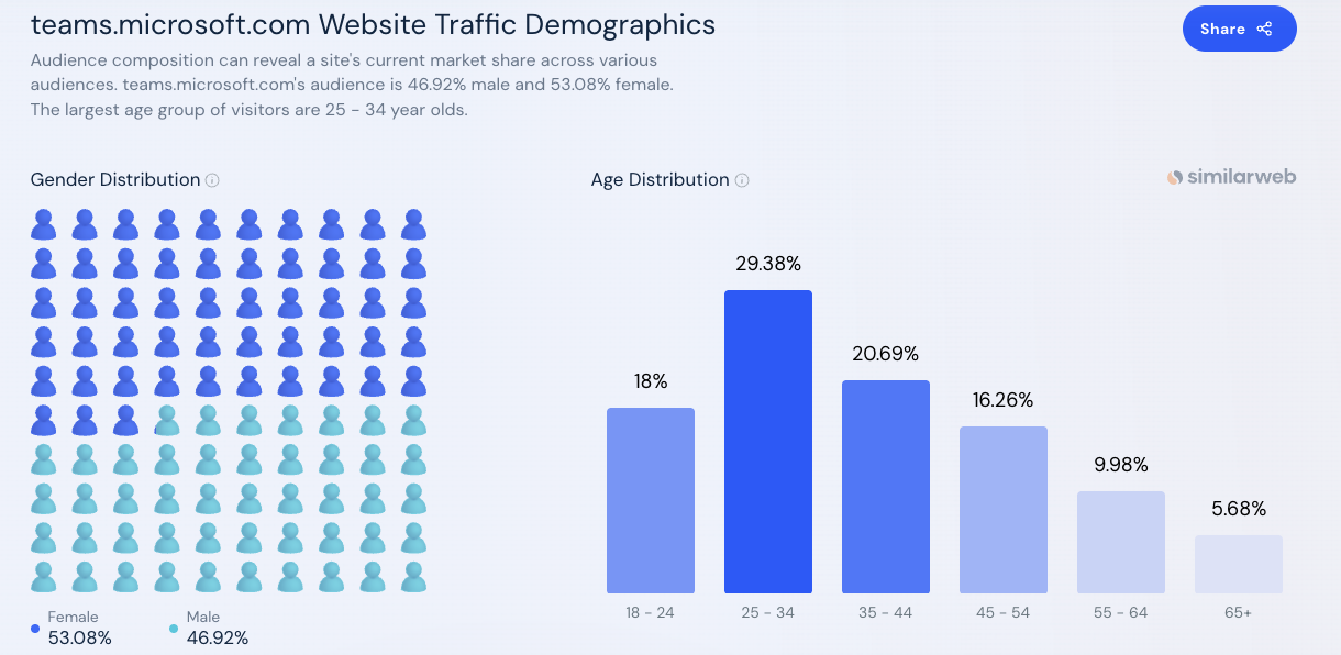 ヤングはSlack指向というレポートだったが、そもそもベースデータ違うじゃないか!比較するなら、https://www.similarweb.com/website/slack.com/#demographics とhttps://www.similarweb.com/website/teams.microsoft.com/#demographics 年齢分布はほとんど変わらない。男女差がでるのはおもろい。